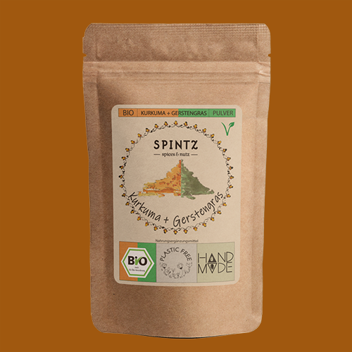 Kurkuma aus Indien und Gerstengras aus Deutschland – schonend getrocknet und vermahlen, um alle wertvollen Inhaltsstoffe zu bewahren. Nach EG-ÖKO-VO zertifiziert und in Deutschland geprüft.