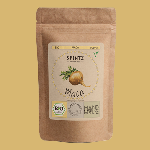 Bio Maca Pulver mit mild-nussigem, leicht malzigem Geschmack. Ideal für Smoothies, Shakes, Müsli oder als Ergänzung in Backwaren.