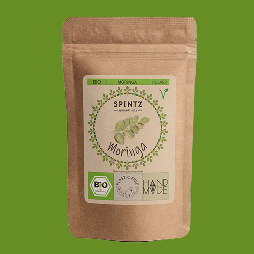 Bio Moringa Pulver mit mild-würzigem, leicht erdigem Geschmack. Ideal für Smoothies, Säfte, Suppen oder als Ergänzung in Gerichten.