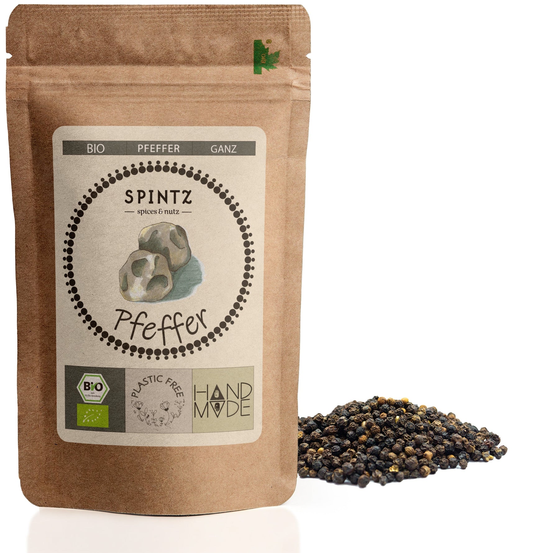 Bio Schwarzer Pfeffer mit intensiv-würzigem Aroma und angenehmer Schärfe. Ideal zum Würzen von Fleisch, Fisch, Gemüse, Suppen und Saucen.